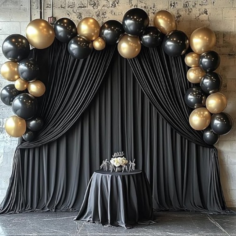 Available in a variety of colors and styles, our draped backdrops can be customized to match your event theme — whether you’re going for soft romance, modern minimalism, or full glamour. Perfect for sweetheart tables, photo booths, or stage designs.